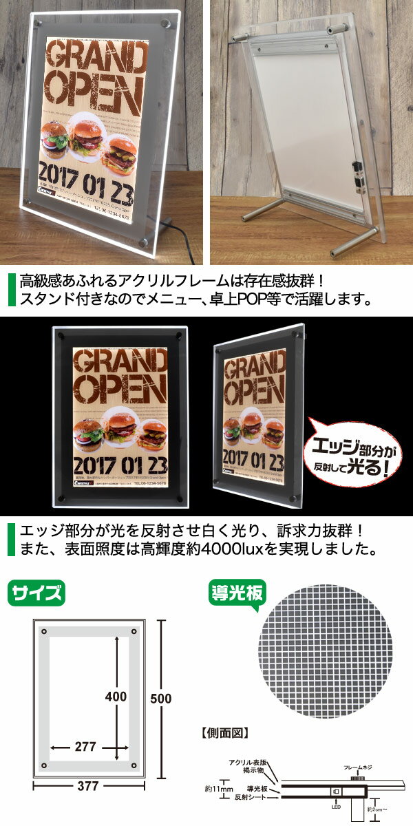 エッジ部分が反射して光り、訴求力抜群! 広告やディスプレイにオススメなLEDライティングボード アクリルフレーム A3サイズ 広告やディスプレイにオススメ! アクリルフレームLEDライティングボード。