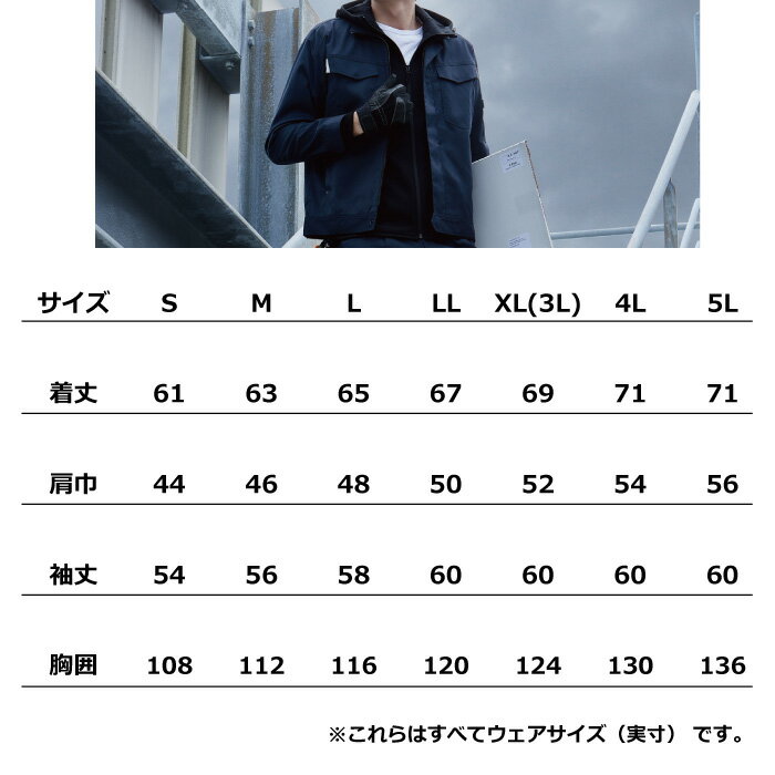 作業服 WA21911XL4L〜5L他のサイズを選ぶ●●商品説明●関連商品※WA11911長袖ブルゾン※WA11914ワンタックパンツ※WA11915ワンタックカーゴパンツ※WA11919長袖シャツ※WA21914ワンタックパンツ※WA21915ワンタックカーゴパンツ※C-91キャップ●秋冬用●素材:ストレッチツイル ポリエステル65%・綿35%、ボタン/プラスチック●帯電防止素材、ストレッチ、反射パイピング、実用新案登録済 懐ポケット(静電テープ引手付き)、カラー配色、カラーカン止め、背裏メッシュ、肩ダーツ、脇消臭テープ(デオグラフト)、袖口調節釦、裾調調節釦、左袖二重ペン差し、左胸二重ペン差し、左胸ポケットネームループ●サイズ:S(着丈/61、肩巾/44、袖丈/54、胸囲/108)、M(着丈/63、肩巾/46、袖丈/56、胸囲/112)、L(着丈/65、肩巾/48、袖丈/58、胸囲/116)、LL(着丈/67、肩巾/50、袖丈/60、胸囲/120)、XL(着丈/69、肩巾/52、袖丈/60、胸囲/124)、4L(着丈/71、肩巾/54、袖丈/60、胸囲/130)、5L(着丈/71、肩巾/56、袖丈/60、胸囲/136)●カラー:ネイビー、ブルー、シルバー、モスグリーン、キャメル商品仕様マルチファンクション。